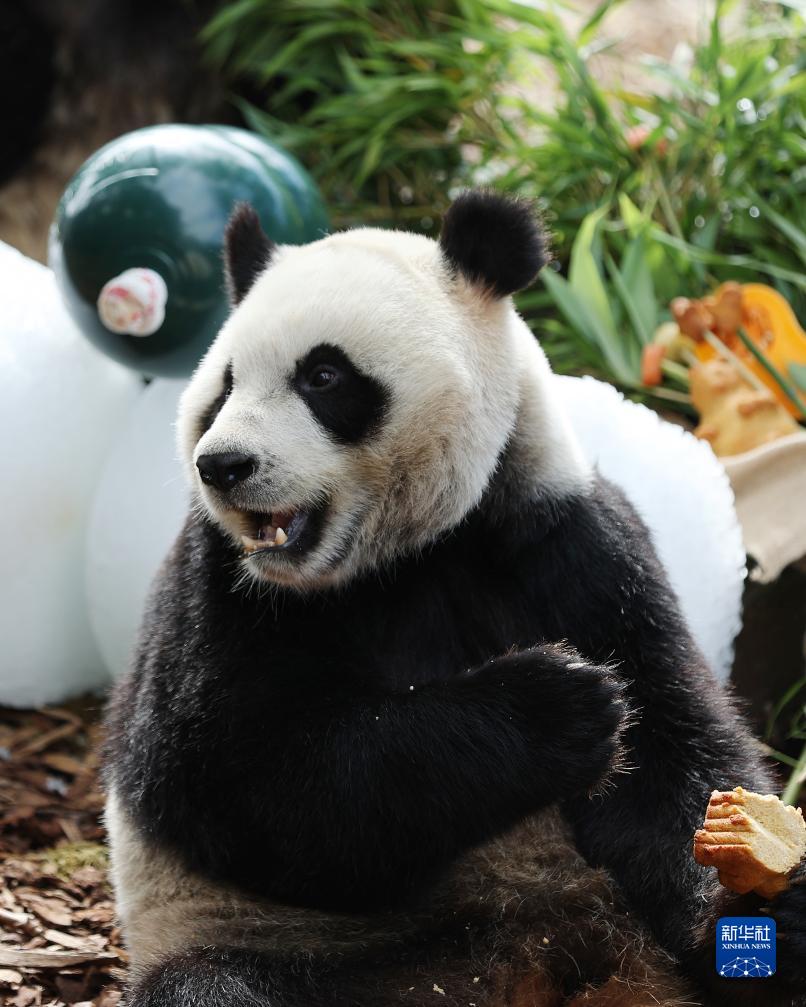 8月16日,在比利時布呂熱萊特的天堂動物園,大熊貓“寶妹”享用“生日大餐”。