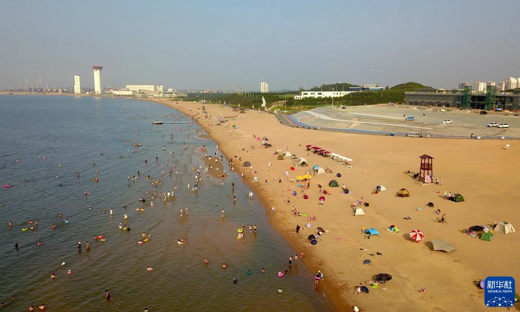 8月16日,游客在山東省萊州市三山島的海濱風景區游玩(無人機照片)。