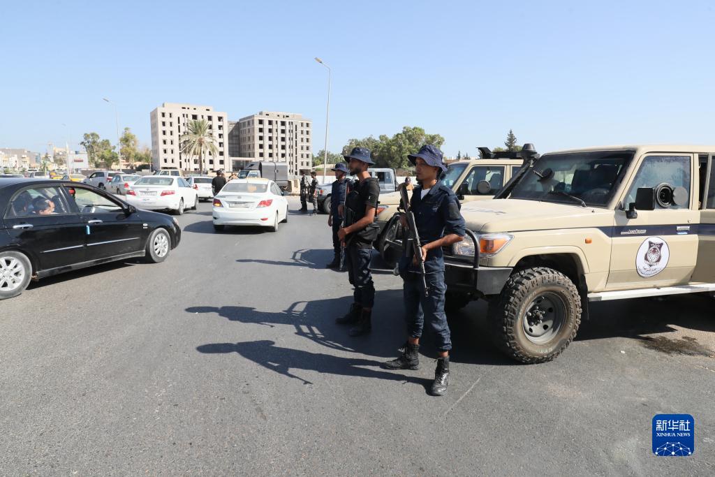 8月16日,利比亞沖突?;鸷?,利比亞公共安全部門人員在的黎波里的艾因扎拉區保障安全。