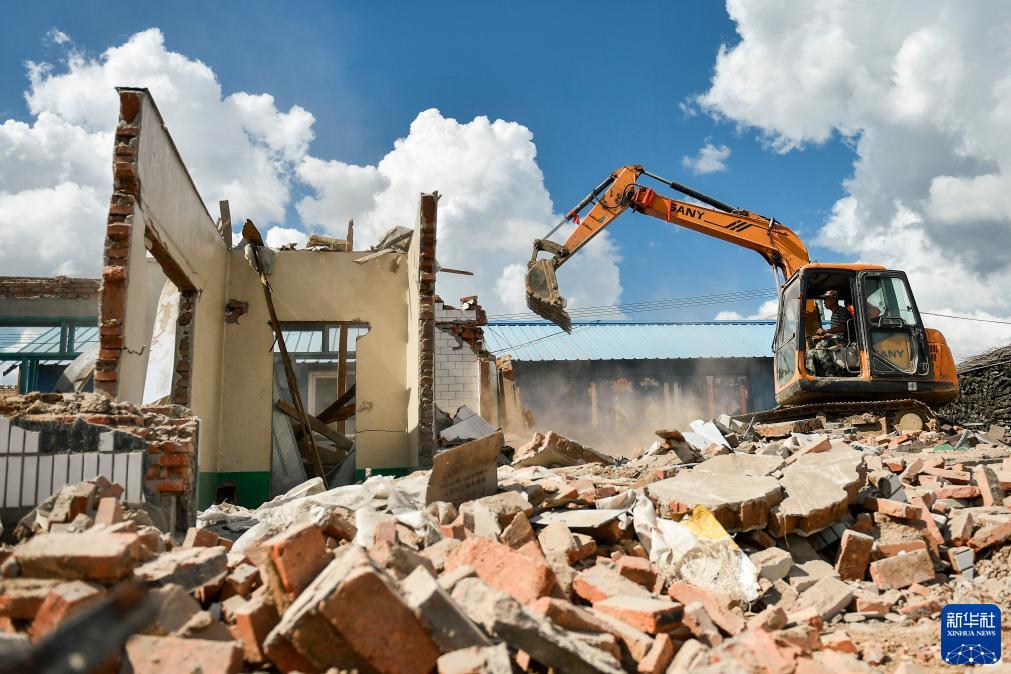 工作人員對舒蘭市開原鎮模范村的受損房屋進行拆除重建工作(8月16日攝)。