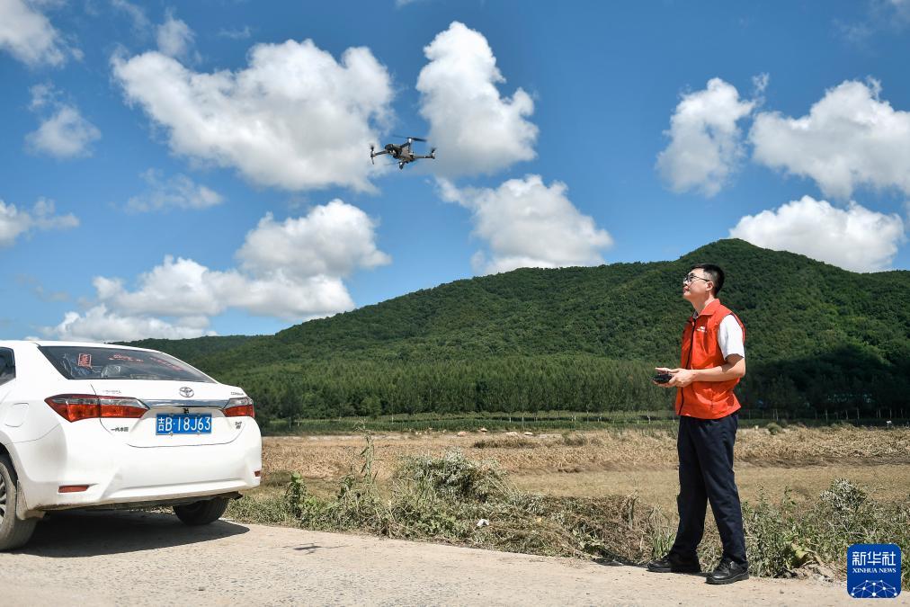 農業保險理賠人員使用無人機查看舒蘭市金馬鎮周邊農田受災情況(8月15日攝)。