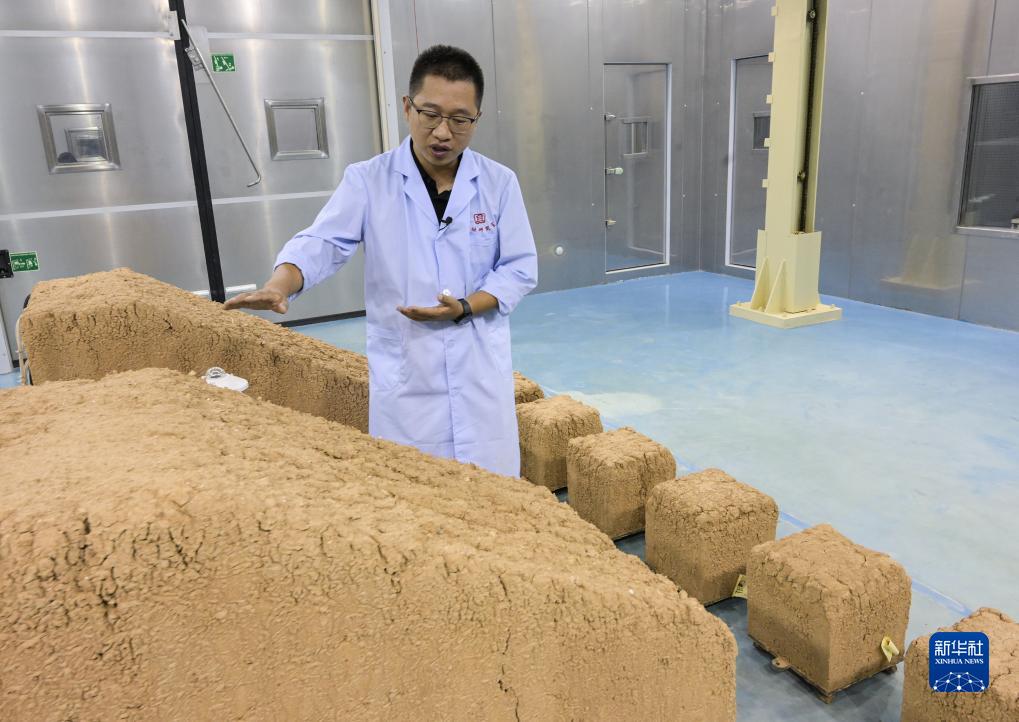 在敦煌研究院多場耦合實驗室內,一位工作人員介紹針對陜西西安秦東陵模型所進行的環境模擬實驗情況(8月3日攝)。