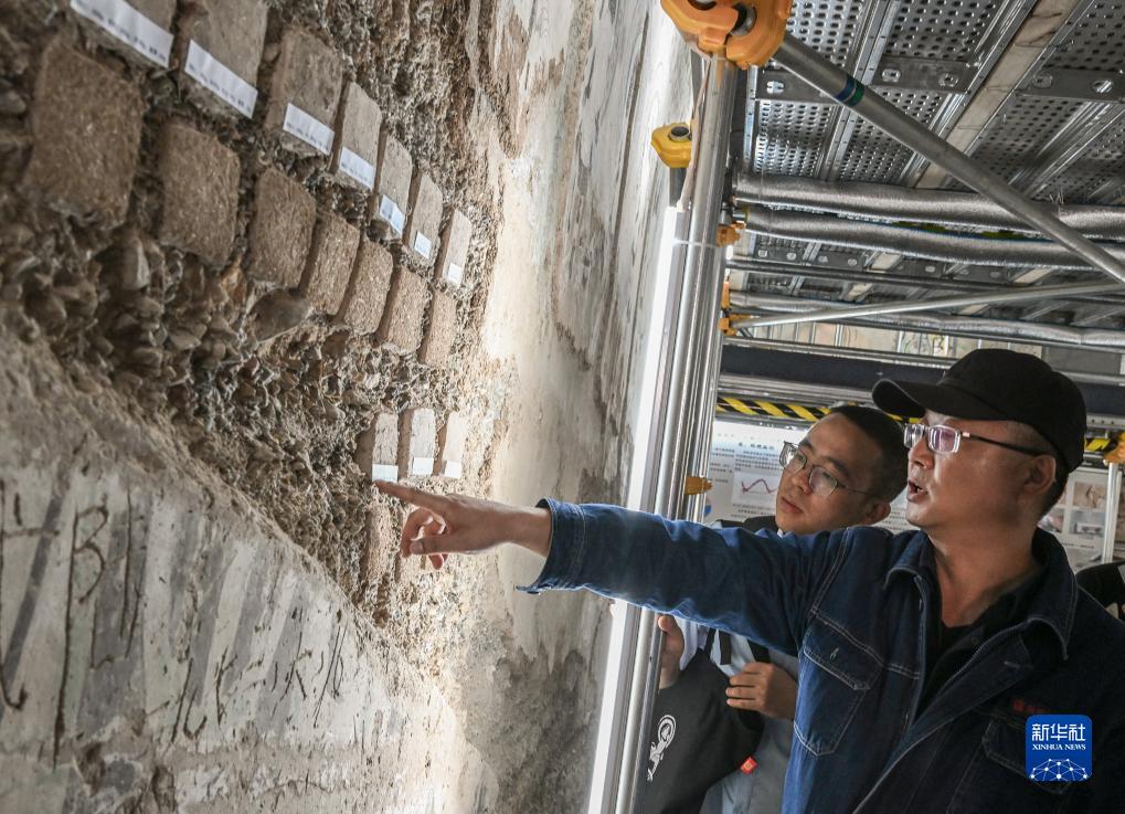 在敦煌莫高窟正在保護修繕的第55窟內,文保工作者對現場模擬試塊進行對比測試(8月3日攝)。