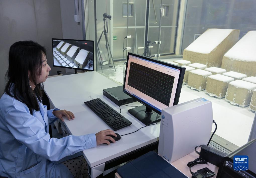 在敦煌研究院多場耦合實驗室內,一位工作人員觀察針對鎖陽城夯土模型所進行的環境模擬實驗情況(8月3日攝)。