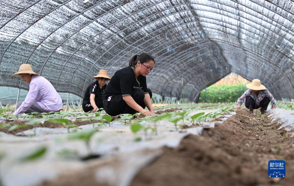 8月16日,余青青(左三)和工人一起在樅陽縣青園心家庭農場的大棚內除草。
