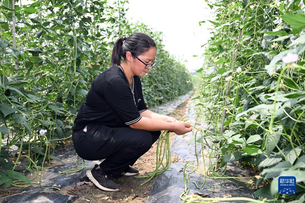 8月16日,余青青在樅陽縣青園心家庭農場采摘豆角。
