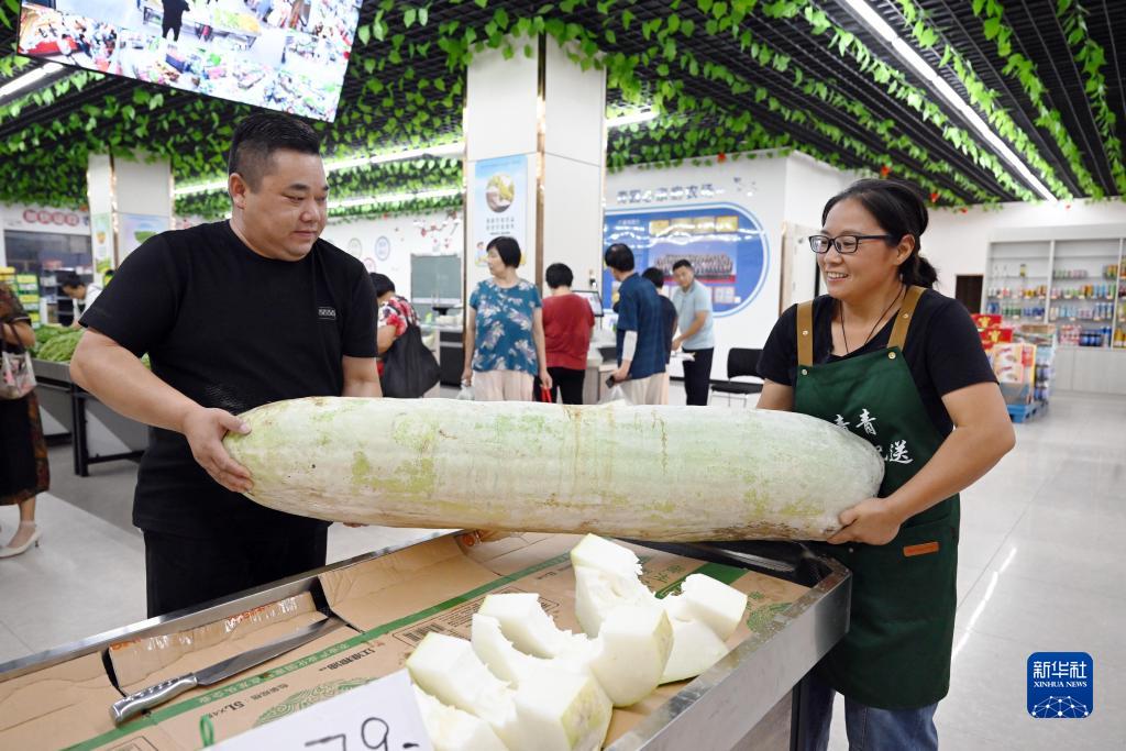 8月17日,余青青(右)在樅陽縣青園心生鮮食品配送中心搬運蔬菜。