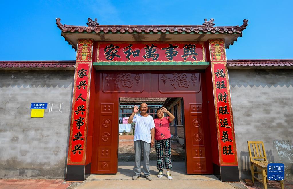 8月17日,在天津市武清區黃花店鎮邵七堤村,一戶返村村民在家門口向記者揮手致意。