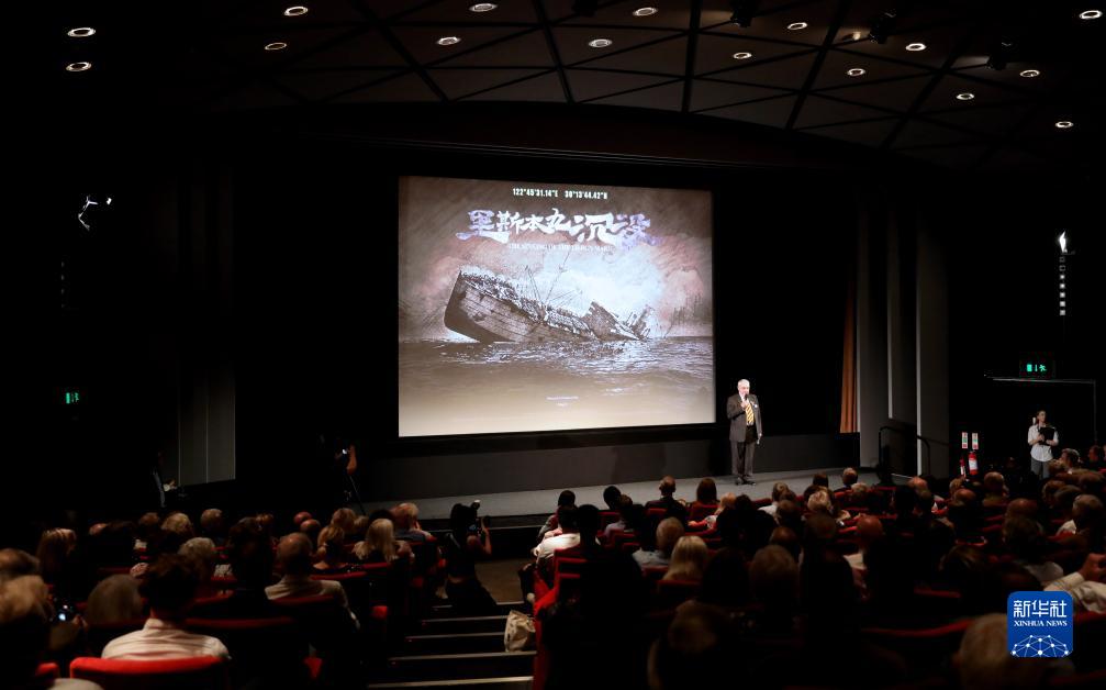 8月15日,在英國倫敦,長期致力于收集整理“里斯本丸”號事件資料的英國退役軍官費恩祺在放映活動上發言。
