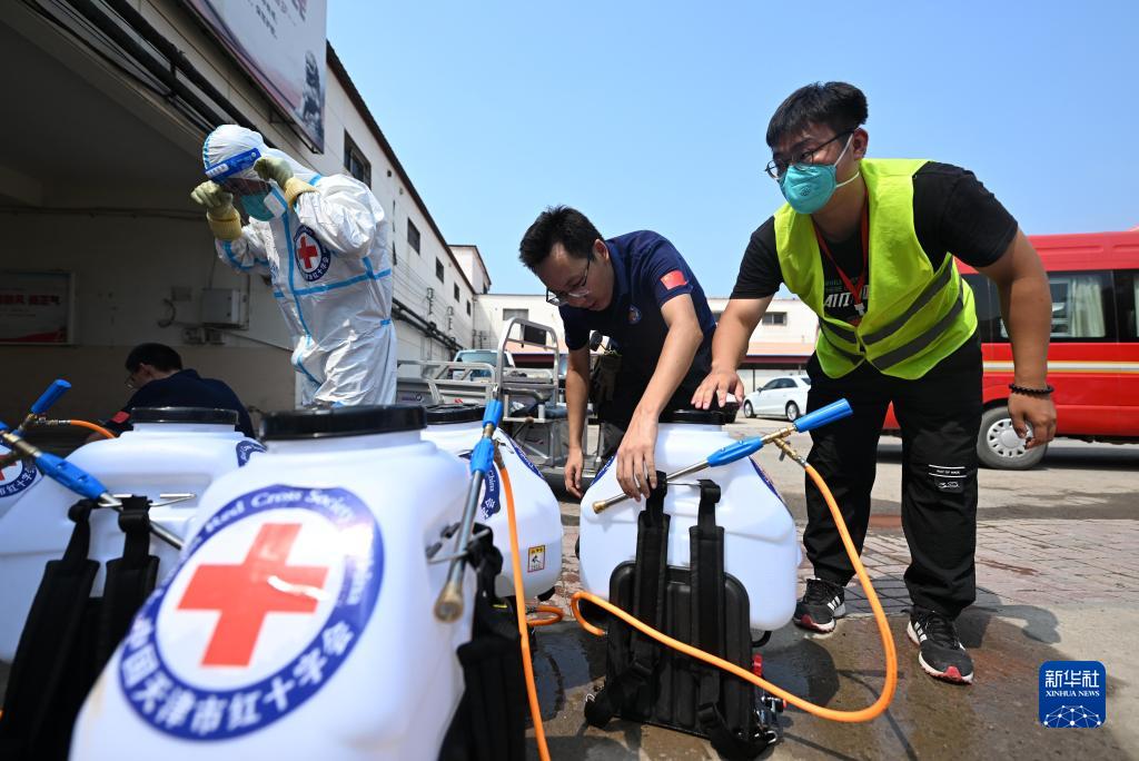 8月17日,在天津市靜海區臺頭鎮,工作人員在整理消殺設備。