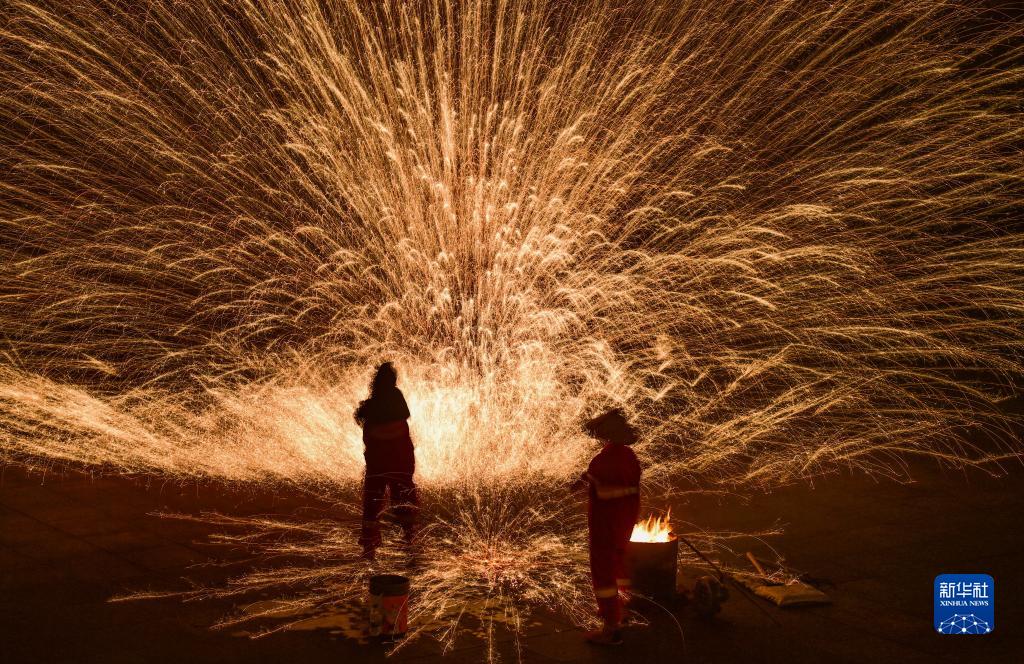 連日來,內蒙古伊金霍洛旗鄂爾多斯文化產業園在景區舉辦“華夏鐵魂”主題鐵花秀活動,民間藝人將燒紅的鐵水在半空中散開,迸濺形成萬千火花,構成壯麗的圖景,成為當地夜經濟的亮點,吸引眾多游人前來觀賞?;顒訉⒊掷m到8月27日。