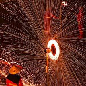 8月16日晚,在鄂爾多斯文化產業園景區,民間藝人表演“鐵花秀”。