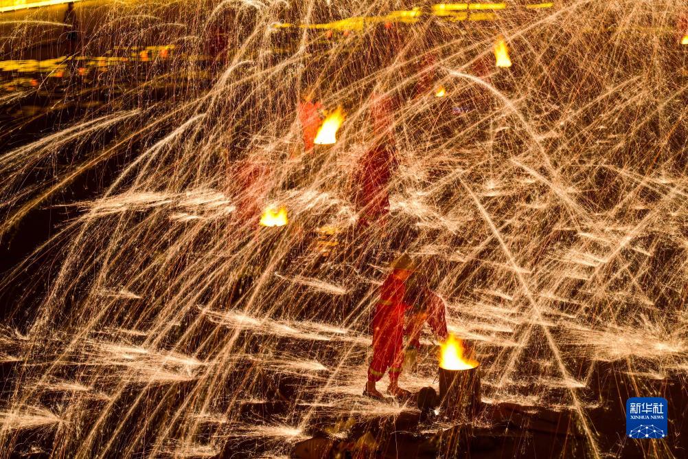 連日來,內蒙古伊金霍洛旗鄂爾多斯文化產業園在景區舉辦“華夏鐵魂”主題鐵花秀活動,民間藝人將燒紅的鐵水在半空中散開,迸濺形成萬千火花,構成壯麗的圖景,成為當地夜經濟的亮點,吸引眾多游人前來觀賞?;顒訉⒊掷m到8月27日。