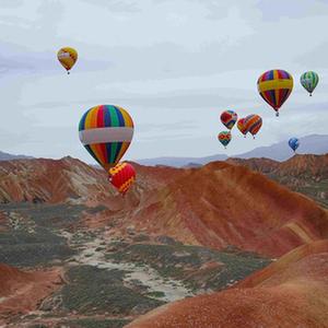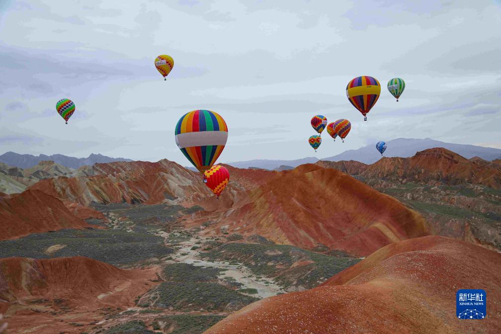 當日,甘肅張掖第三屆張掖七彩丹霞熱氣球嘉年華在七彩丹霞景區拉開帷幕。來自全國各地的熱氣球運動員駕乘熱氣球,在七彩丹霞上空進行飛行表演,上演熱氣球與丹霞的美麗邂逅。