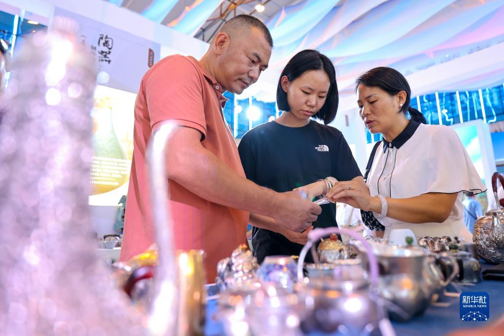 8月17日,參觀者在銀器鍛制技藝展位上選購商品。