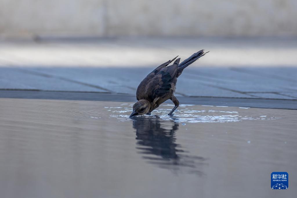 8月17日,在美國得克薩斯州達拉斯市,一只小鳥在飲水。