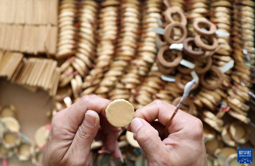 8月17日,崔凱在遼寧省營口市自己家中制作吉祥輪彩紙風車泥鼓。