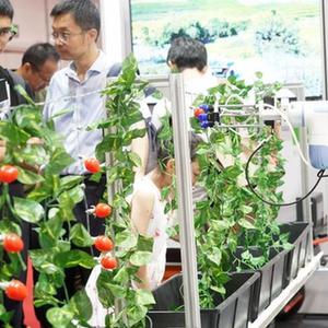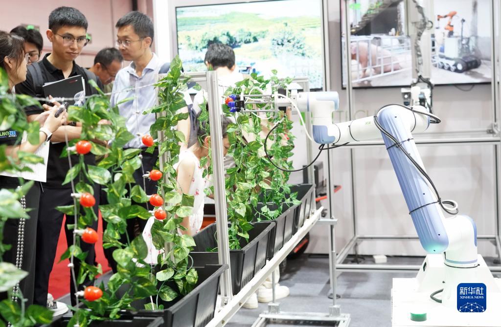 這是在2023世界機器人大會現場拍攝的智能采摘機器人(8月17日攝)。