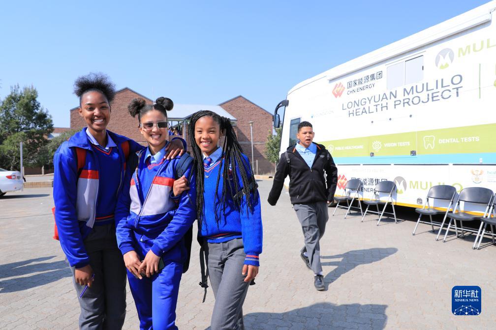 8月10日,在南非德阿鎮一所學校,學生在醫療大巴車前合影。