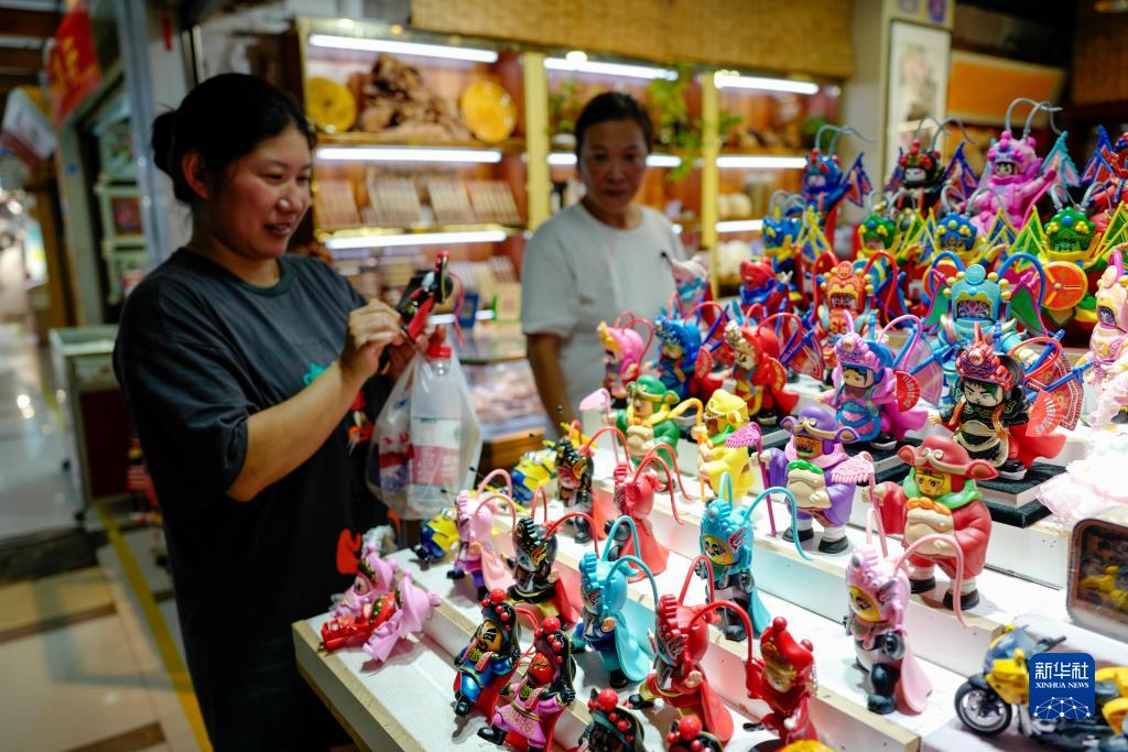 游客在重慶洪崖洞夜市街區的一家店鋪內選購民俗紀念品(8月3日攝)。