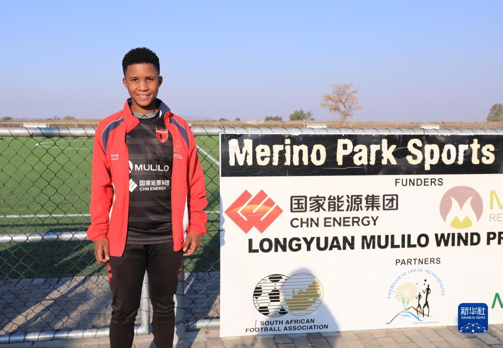 8月10日,在南非北開普省德阿鎮,當地女中學生莎倫·奧利芬特在由龍源南非公司翻修一新的足球場邊接受采訪。