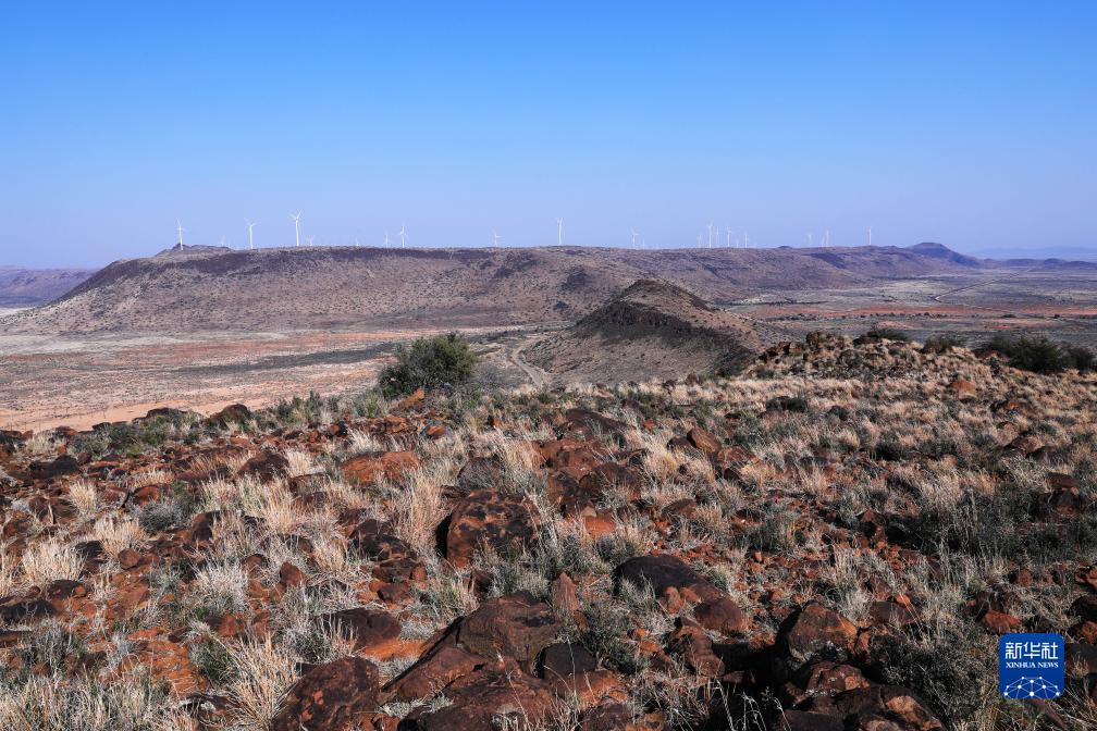 這是8月10日在南非北開普省德阿鎮拍攝的龍源南非公司德阿風電項目風機。