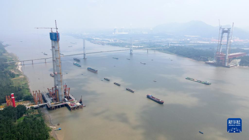 8月18日拍攝的建設中的京臺高速銅陵長江公鐵大橋,大橋南北兩座主塔完成封頂(無人機照片)。