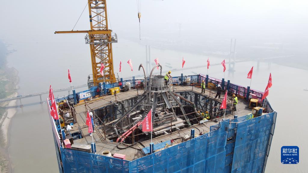 8月18日拍攝的京臺高速銅陵長江公鐵大橋3號主塔封頂施工現場(無人機照片)。