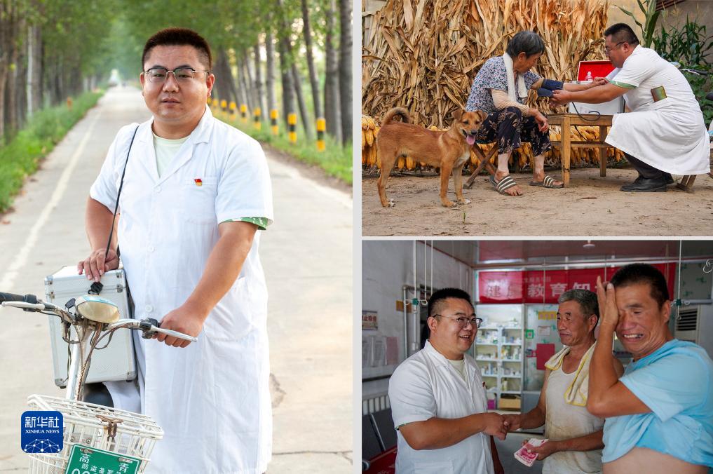 這是山東省淄博市高青縣黑里寨鎮的鄉村醫生張春輝,從醫22年(拼版照片,均為8月17日攝)。左圖為張春輝在山東省淄博市高青縣黑里寨鎮的巡診路上留影;右上圖為張春輝(右)在山東省淄博市高青縣黑里寨鎮為村民測量血壓;右下圖為村民向張春輝(左一)歸還住院墊付的借款時激動流淚。