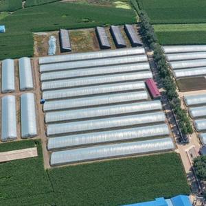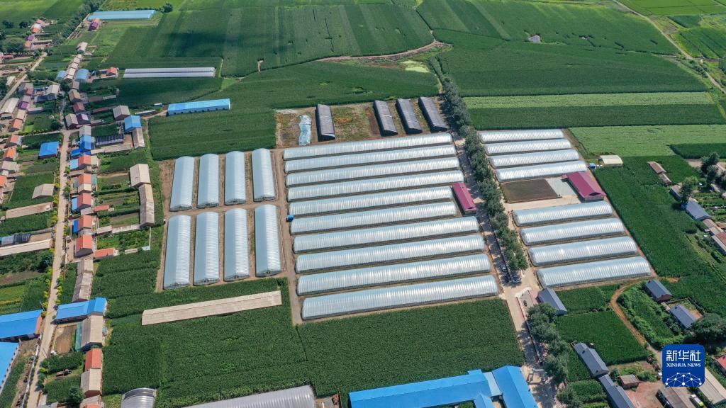 這是在吉林省德惠市朱城子鎮沿河村拍攝的程雪家庭農場玫瑰大棚(8月17日攝,無人機照片)。