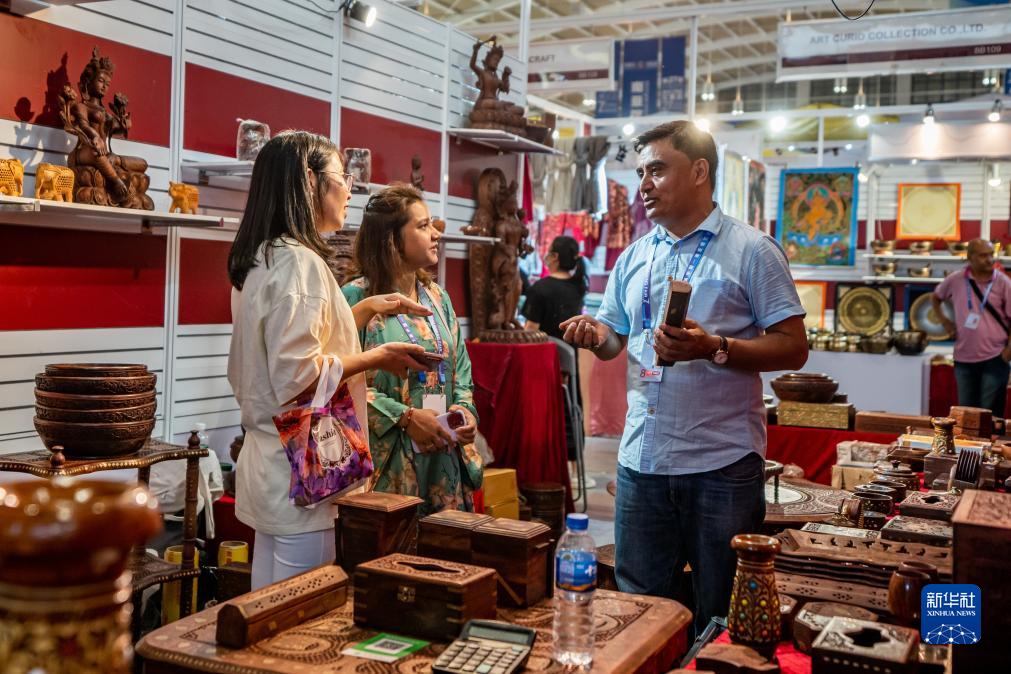 8月18日,尼泊爾展區的參展商(右)在推介特色商品。
