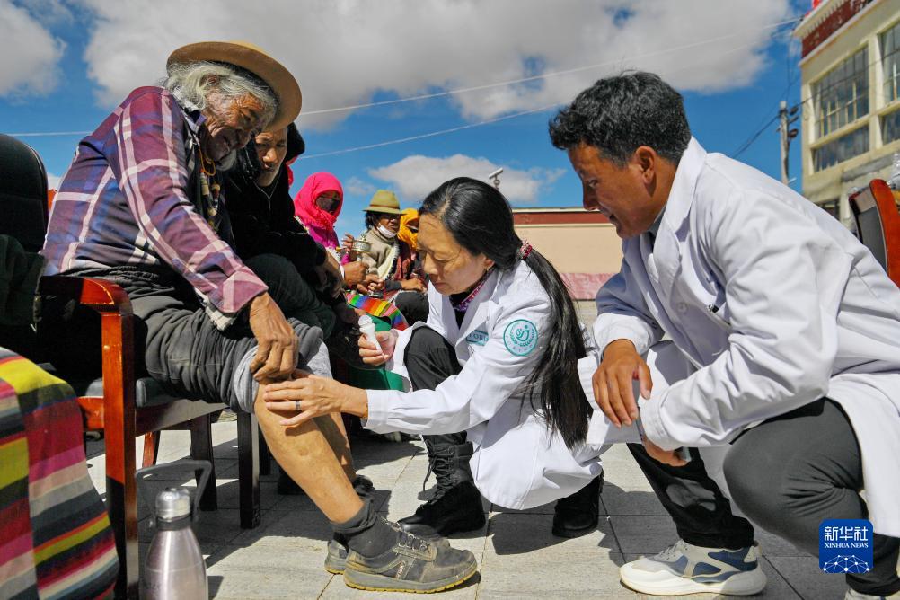 8月18日,在阿里地區措勤縣曲洛鄉,西藏阜康腫瘤醫院康復理療師唐穎(右二)為當地群眾義診。