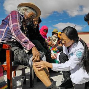 當日,西藏阜康腫瘤醫院的康復理療師來到海拔4000余米的阿里地區措勤縣曲洛鄉,聯合當地衛生院的醫生為當地牧民義診。