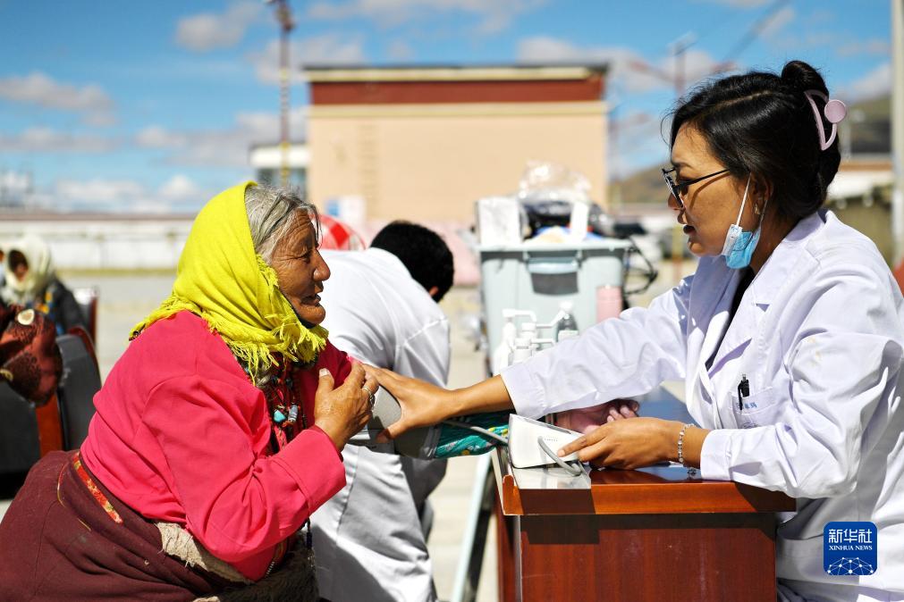8月18日,在阿里地區措勤縣曲洛鄉,鄉衛生院醫生巴桑卓瑪為一名老人測量血壓。