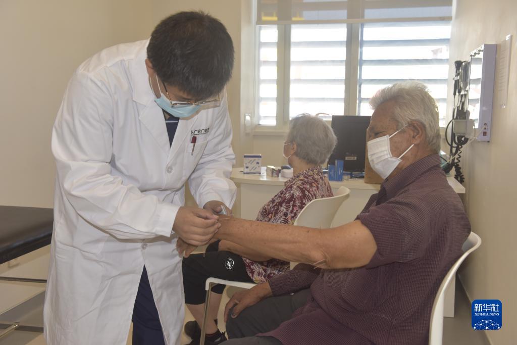 8月18日,在柬埔寨首都金邊的考斯瑪中柬友誼醫院,援柬中醫醫療隊醫生為患者診療。