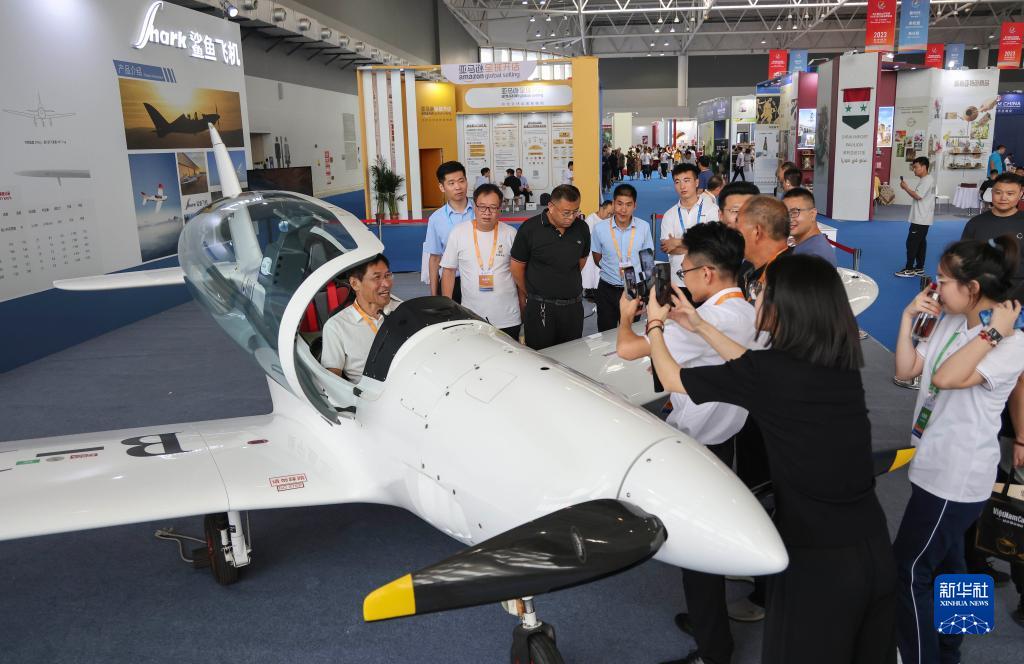 8月18日,客商在第三屆RCEP區域(山東)進口商品博覽會上了解體驗一款國產小飛機。
