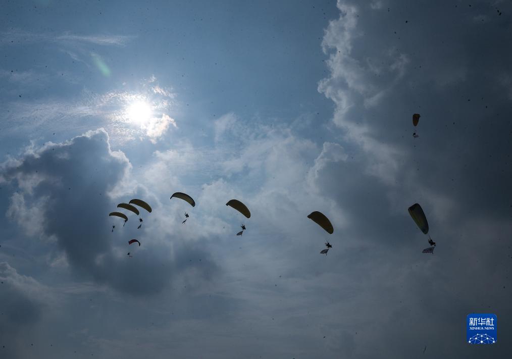 這是8月18日在第十屆沈陽法庫國際飛行大會開幕式上拍攝的動力傘飛行表演。