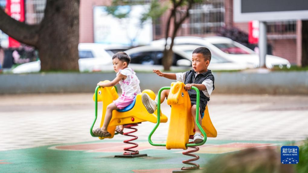 小朋友在六盤水市鐘山區黃土坡街道文明巷小區中心廣場玩耍(8月17日攝)。