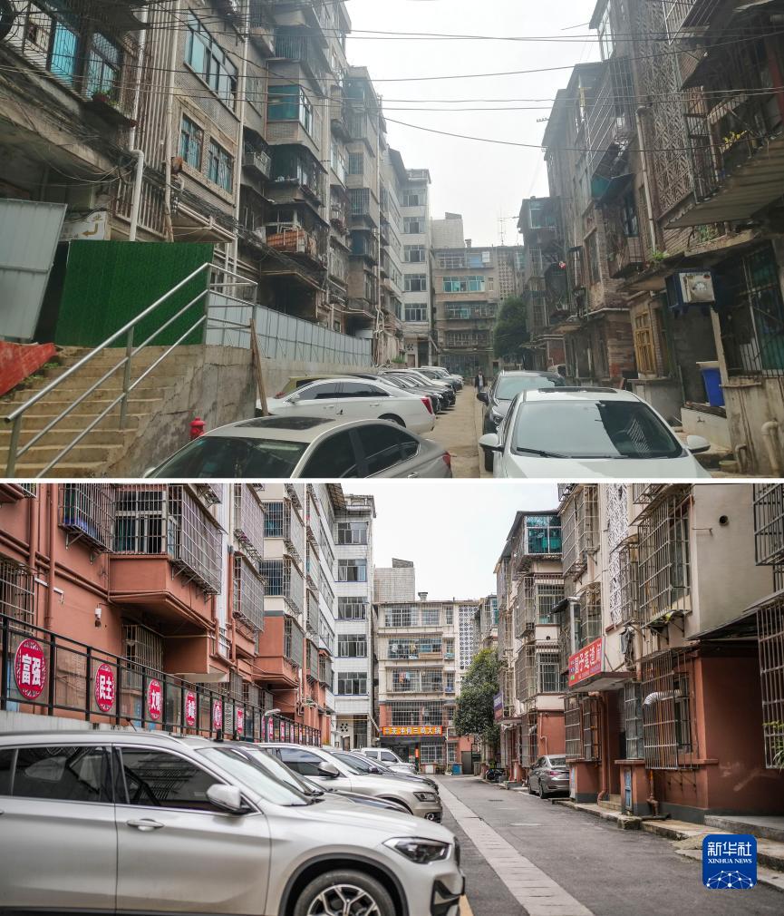 拼版照片:上圖為改造前的六盤水市鐘山區黃土坡街道文明巷小區(資料照片);下圖為改造后的文明巷小區(8月17日新華社記者陶亮攝)。