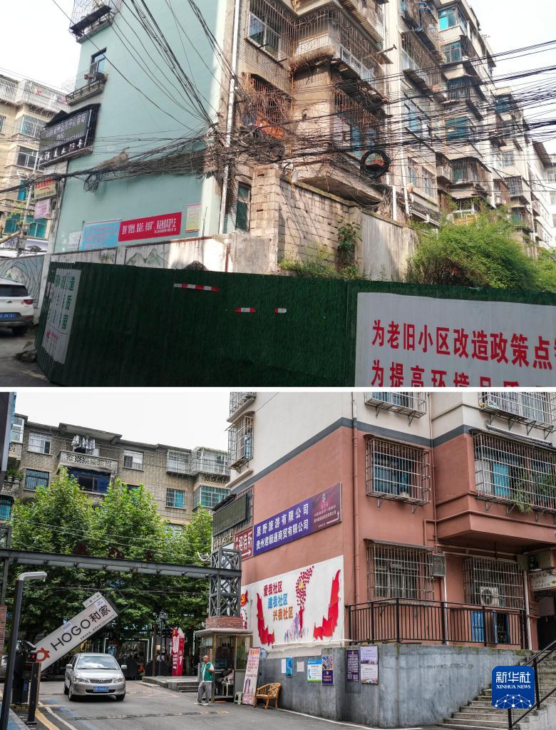 拼版照片:上圖為改造前的六盤水市鐘山區黃土坡街道文明巷小區(資料照片);下圖為改造后的文明巷小區(8月17日新華社記者陶亮攝)。