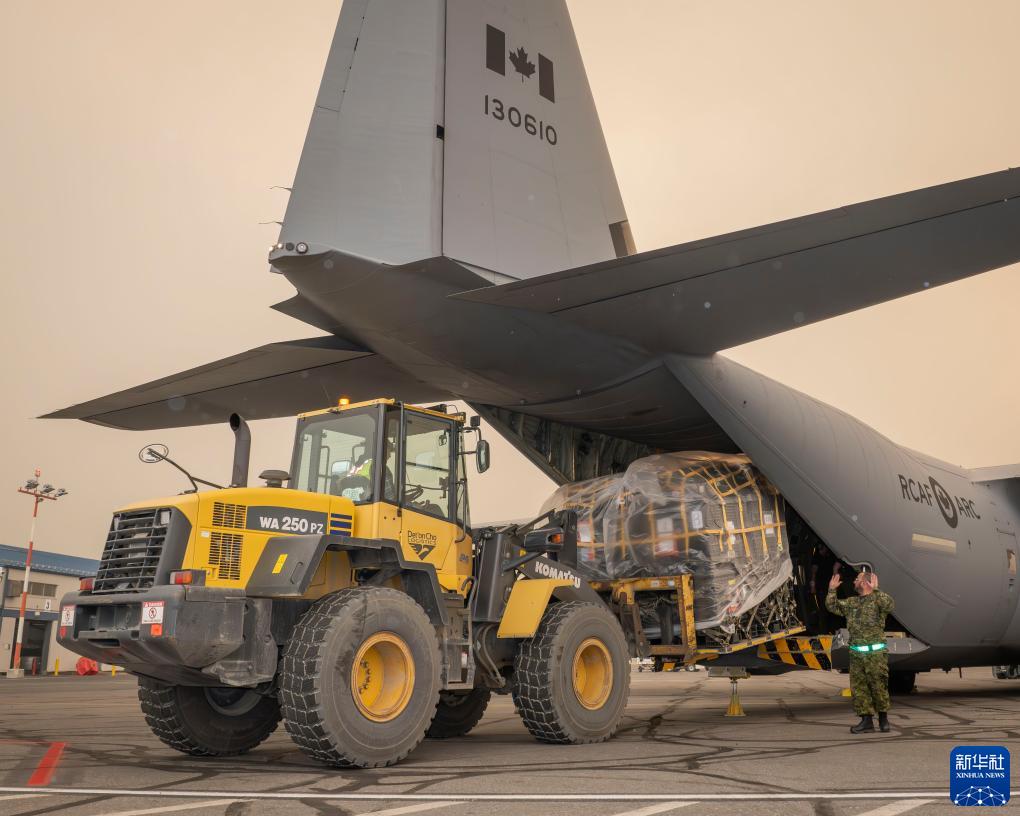這張加拿大武裝部隊8月14日拍攝的照片顯示一架軍機在耶洛奈夫機場卸載救災物品。