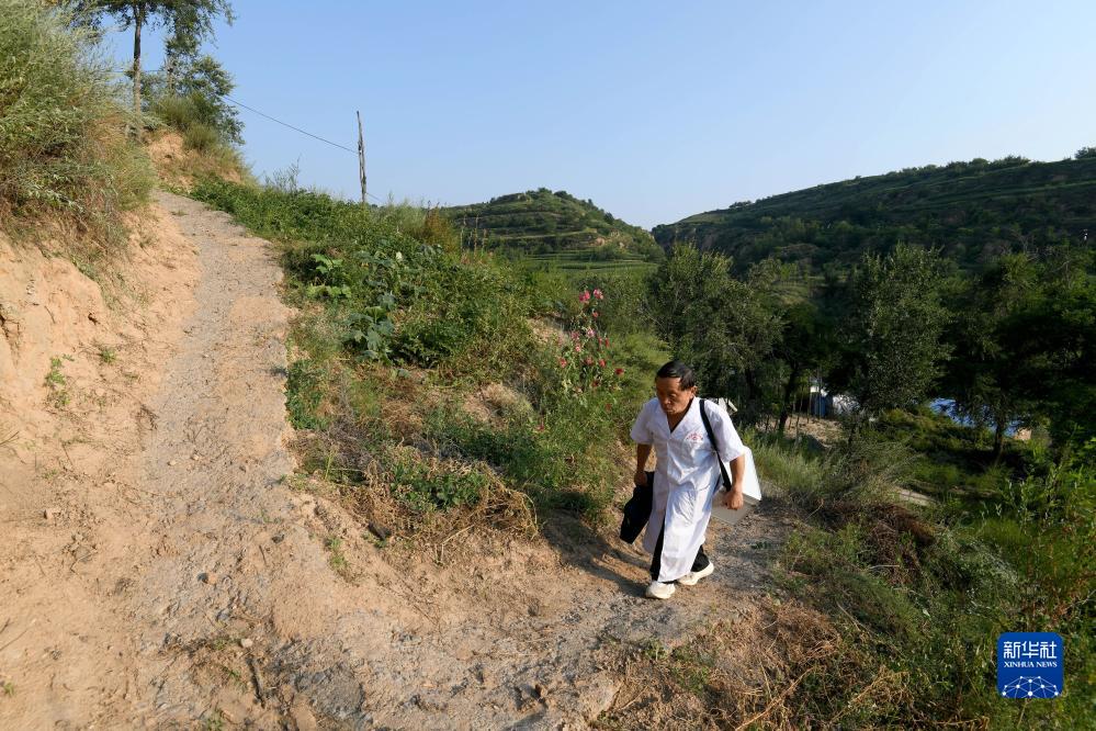 在石樓縣龍交鄉王家溝村,楊興榮背著藥箱走在出診的山路上(8月14日攝)。