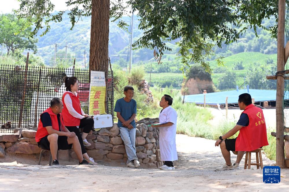 在石樓縣龍交鄉王家溝村,村醫楊興榮(右二)和駐村幫扶工作隊一起入戶走訪(8月16日攝)。