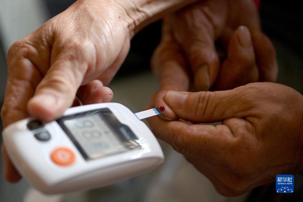 在石樓縣龍交鄉王家溝村,村醫楊興榮在為村民測量血糖(8月14日攝)。