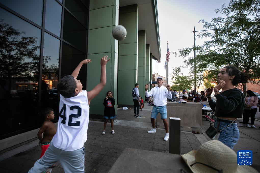 8月17日,在美國伊利諾伊州芝加哥第9區警察局外,移民玩排球消磨時間。