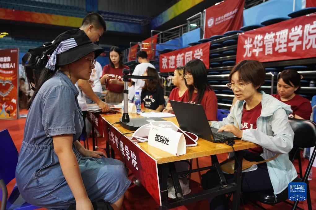 8月19日,在北京大學邱德拔體育館,一名光華管理學院的2023級本科新生(左一)報到。