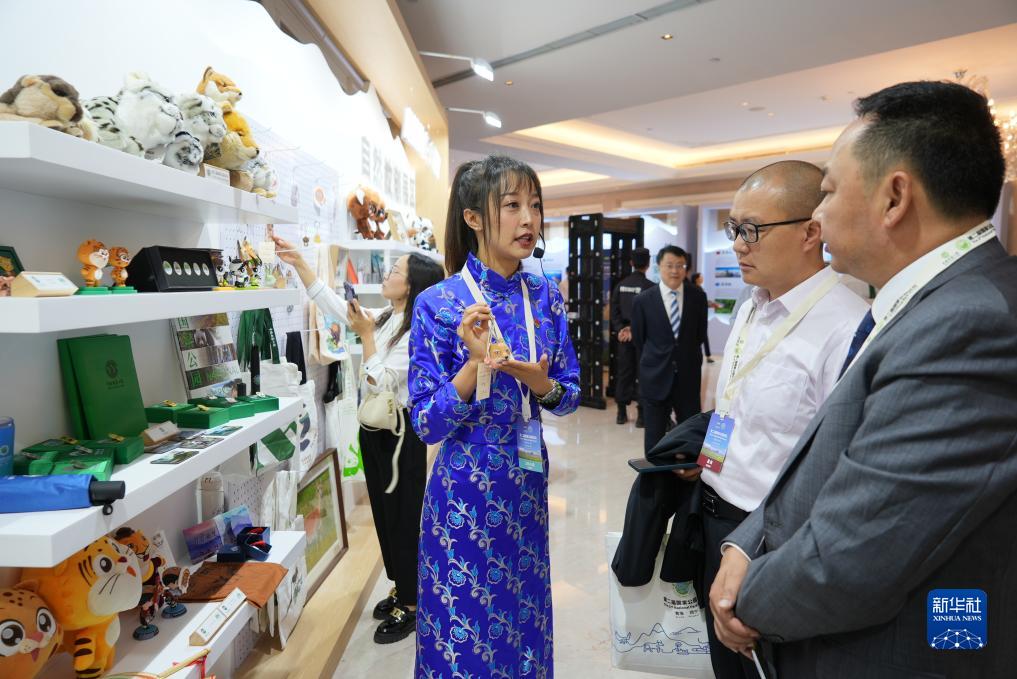 8月19日,第二屆國家公園論壇工作人員在文創產品展區向參觀者介紹國家公園文創產品。
