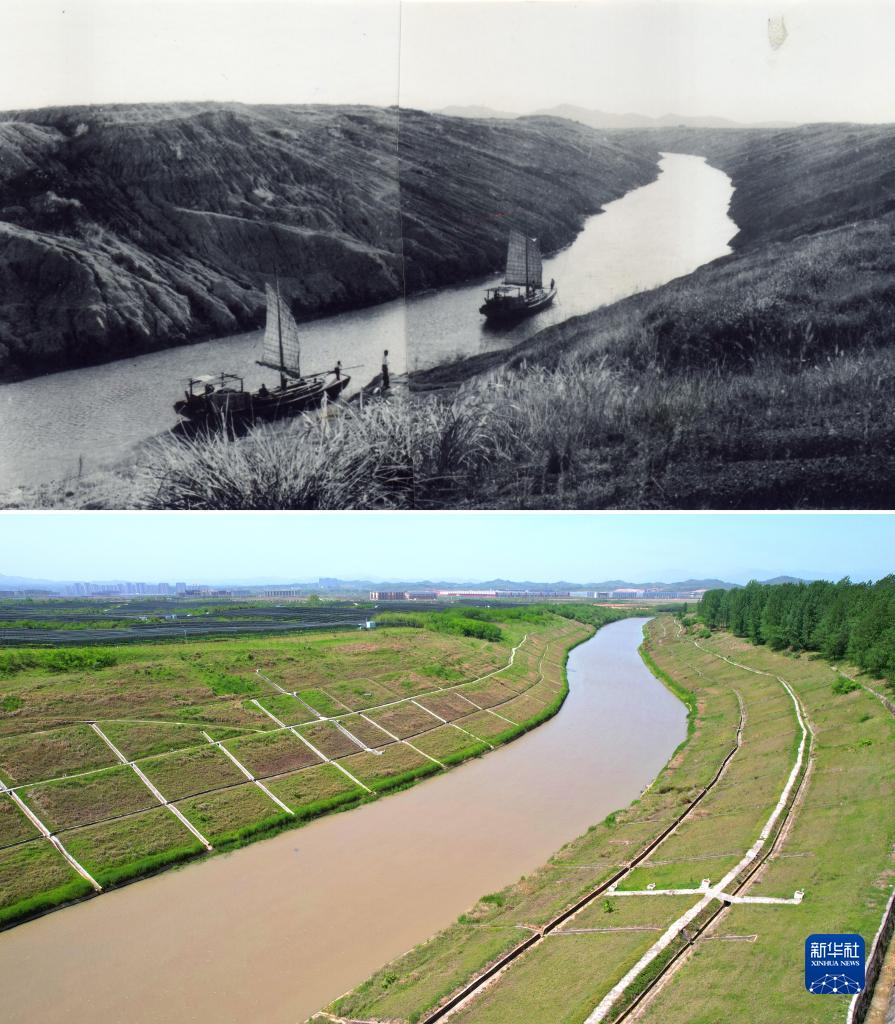 這是一張拼版照片。上圖為:1964年拍攝的位于安徽省六安市葉集區平崗街道的史河總干渠(新華社發 田準攝);下圖為:2023年4月23日拍攝的史河總干渠(新華社發 彭松攝)。