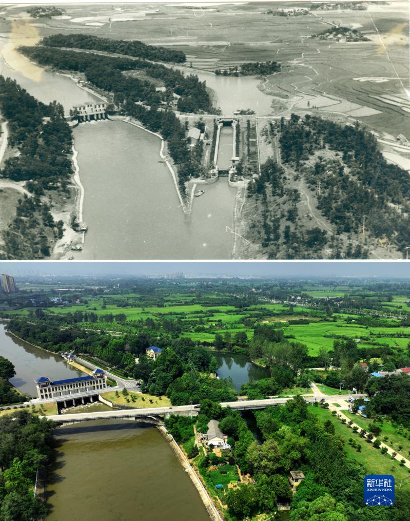 這是一張拼版照片。上圖為:1976年拍攝的位于安徽省六安市金安區的淠河總干渠羅管節制閘(新華社發 田準攝);下圖為:2023年8月18日拍攝的淠河總干渠羅管節制閘(無人機照片,新華社記者杜宇攝)。
