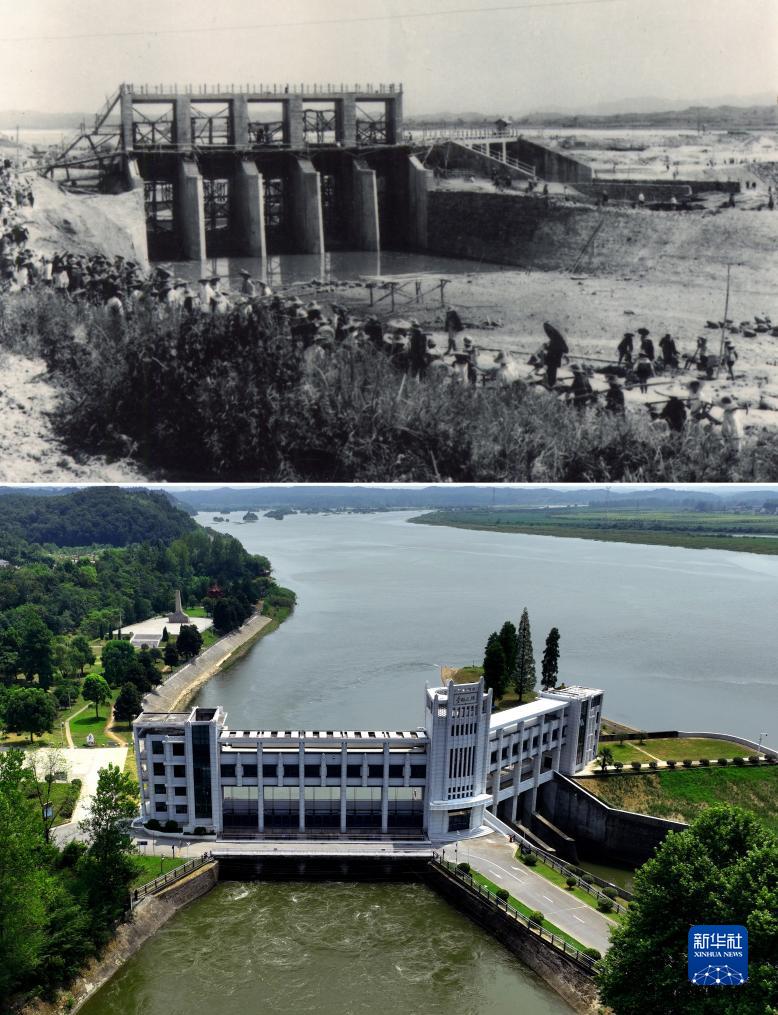 這是一張拼版照片。上圖為:1959年拍攝的位于安徽省六安市裕安區的淠河總干渠渠首橫排頭水利樞紐(新華社發 田準攝);下圖為:2023年8月18日拍攝的淠河總干渠渠首橫排頭水利樞紐(無人機照片,新華社記者杜宇攝)。